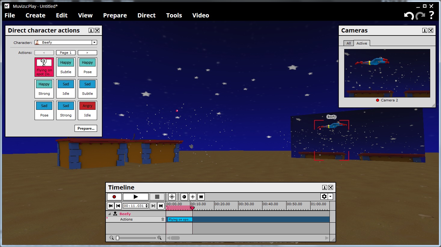 - "Direct > Character Actions", then once the "Direct Character Actions" and "Timeline" windows open you click the big round red "Record" button on the Timeline.